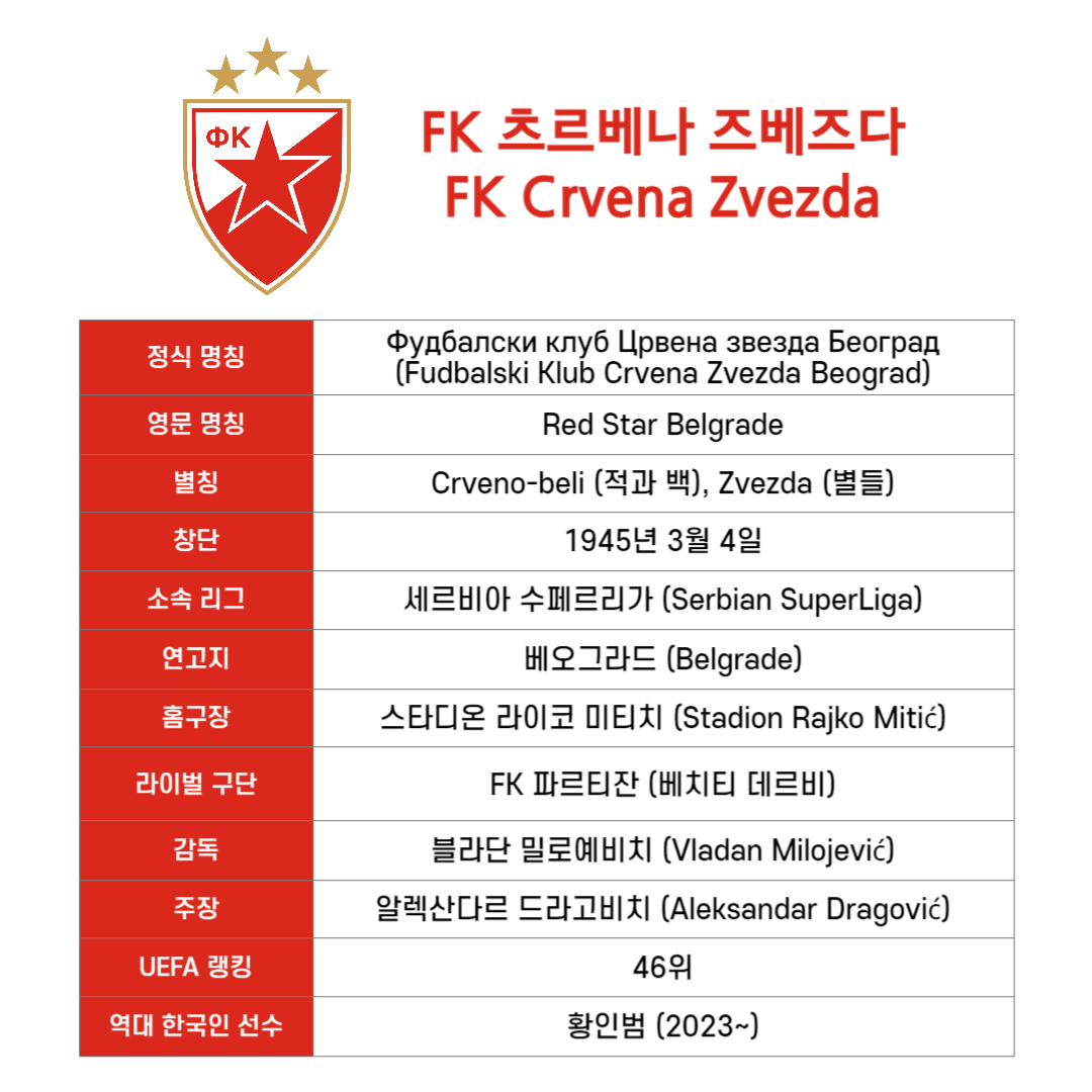 FK 츠르베나 즈베즈다는 세르비아의 수도 베오그라드를 연고로 하는 구단으로, 구단명의 의미는 '붉은 별'입니다.