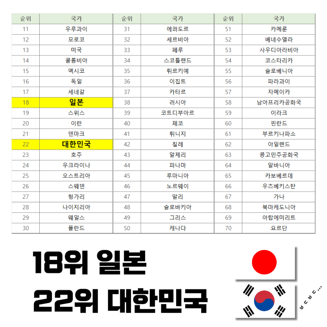 모든 나라들을 하나하나 다 알아보기는 힘들어서 11위부터 70위까지를 한 번 보겠습니다.